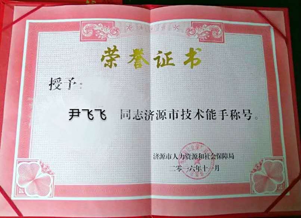 我公司尹飛飛獲得“濟源市技術(shù)能手”光榮稱(chēng)號