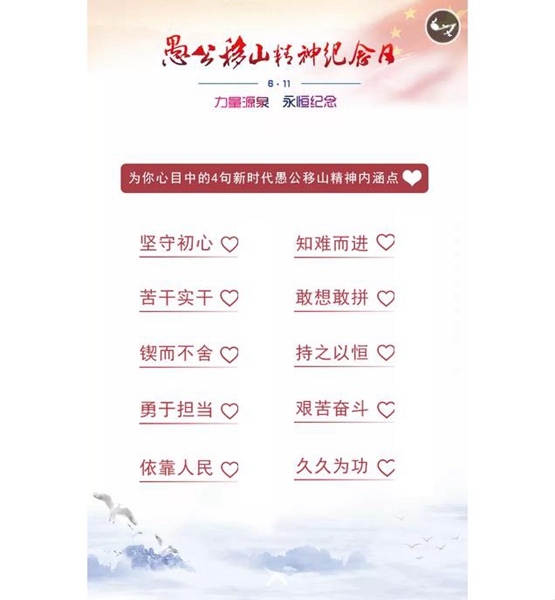 愚公移山精神是中華民族的寶貴精神財富,是黨和人民事業(yè)永續發(fā)展的力量源泉,受到黨和國家領(lǐng)導人的高度重視,成為中國精神、民族精神的代表。2017年濟源將每年的6月11日設立為“愚公移山精神紀念日”,旨在線(xiàn)進(jìn)一步傳承中華民族精神。