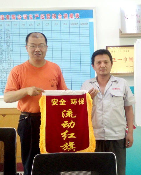 在6月30日上午的安全例會(huì )上,公司首次舉行“安全、環(huán)保流動(dòng)紅旗”授旗儀式。機修車(chē)間副主任王朝陽(yáng)接過(guò)生產(chǎn)副經(jīng)理王茂榮授予的紅旗,激動(dòng)不已,與會(huì )人員則給予熱烈的掌聲,向先進(jìn)致敬。